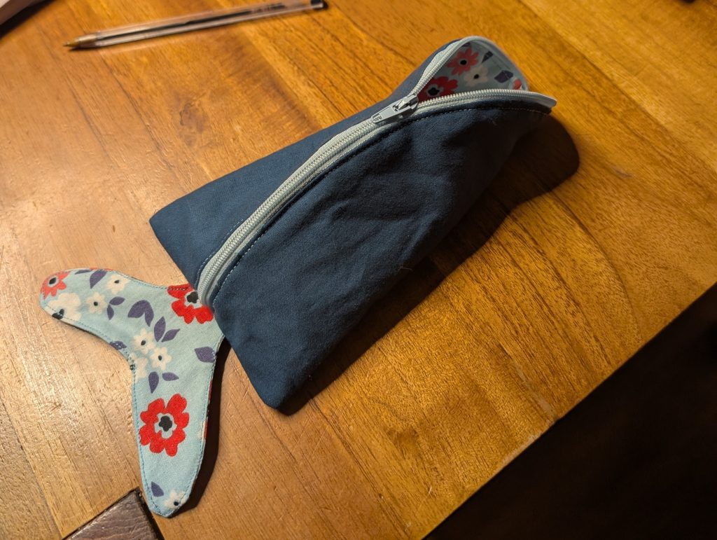 Pitite trousse baleine d’anniversaire. Je crois que la précédente version avait été faite non doublée, ce qui simplifiait bien la chose. Là je ne vois pas bien comment j’aurais pu faire pour que les coutures soient toutes invisibles. Bon au final j’en ai une visible, assez propre car surjeteuse, ça ira ! C’est triplé avec de la vliesline M12, c’est assez fin mais ça apporte quand même du soutien. Au final je suis un poil déçu du tissu un peu terne, mais ça fonctionne. Le patron vient du bouquin allemand de Marie-Cécile, traduction chat GPT, il part pas mal dans le décor (il a zappé la doublure, m’a mis une fermeture éclair de 20 cm au lieu de 65 (wtf) : j’ai plutôt improvisé.