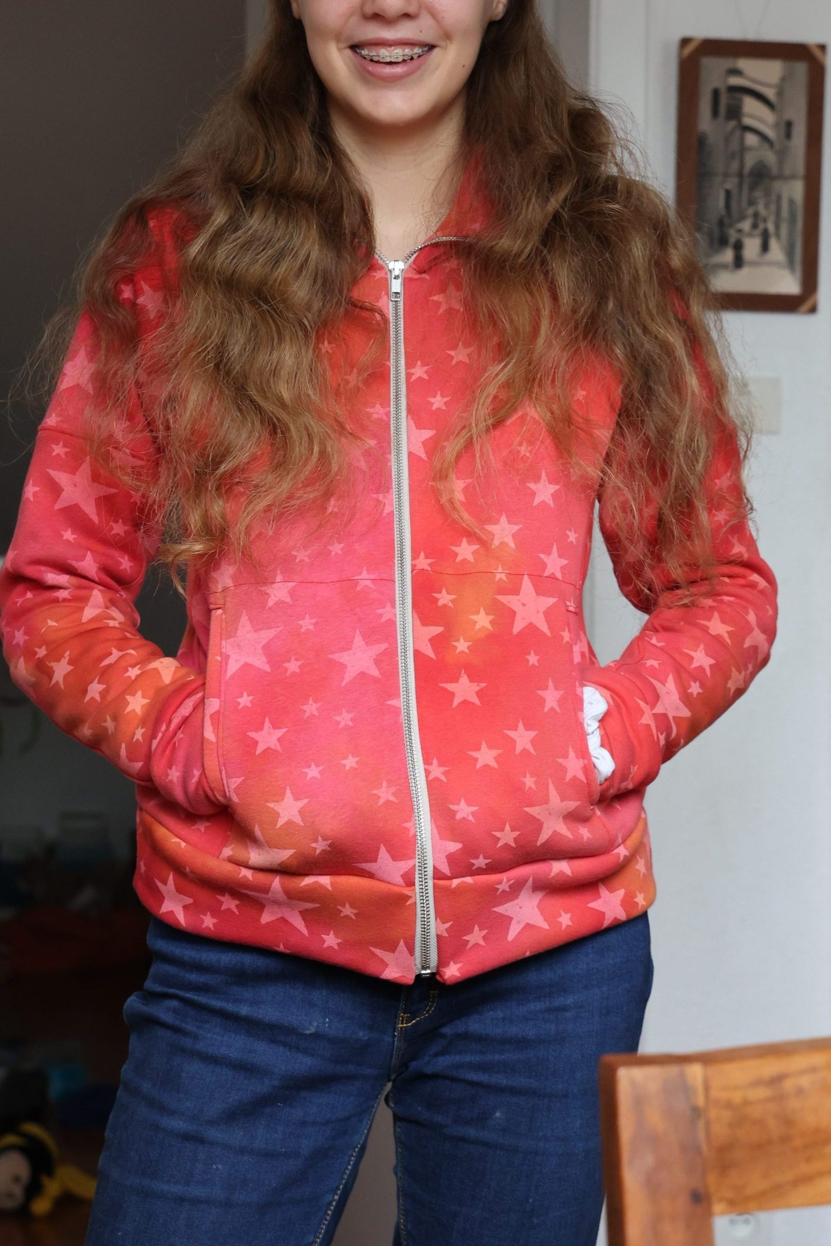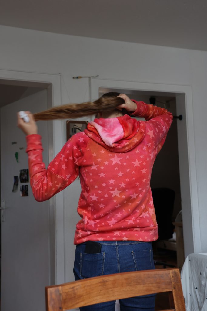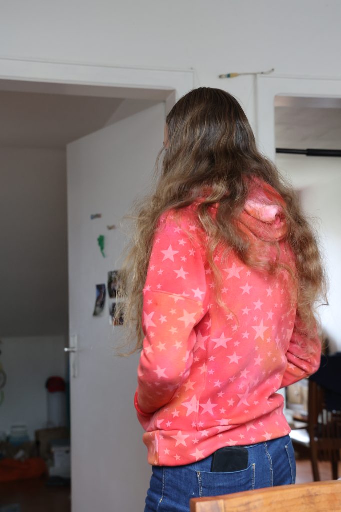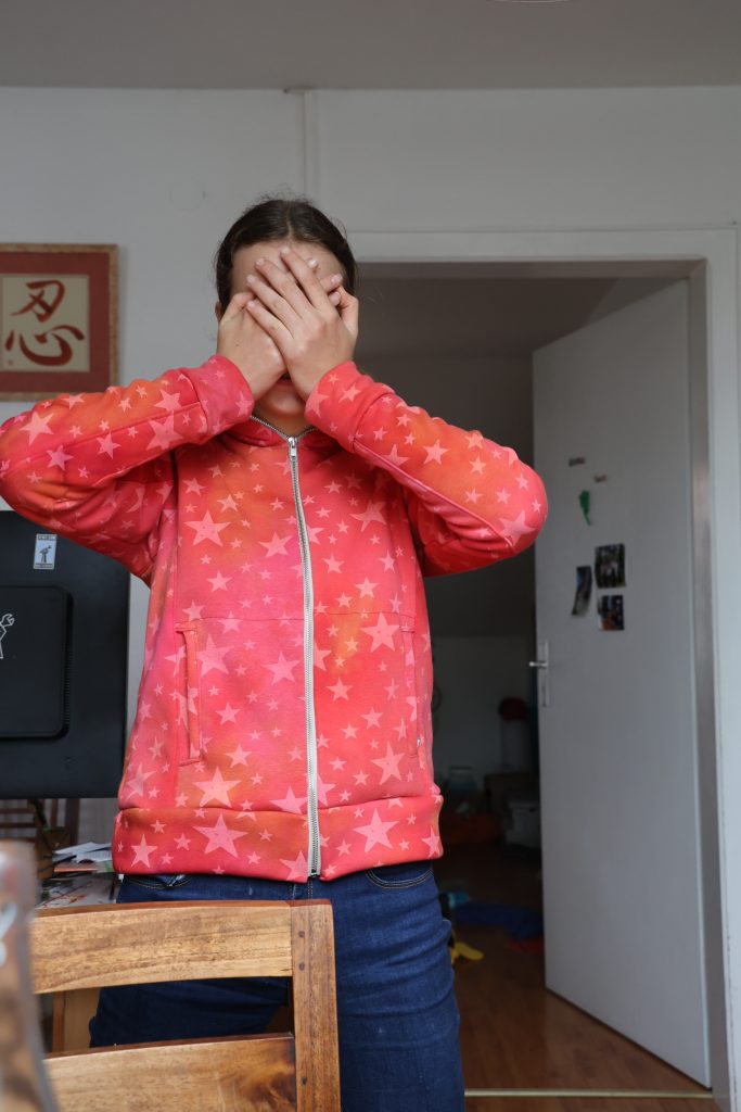 Gabrielle voulait un nouveau sweat d’hiver « chaud », qui puisse s’ouvrir. On est donc reparti sur un Jalie 2795 dont j’avais déjà fait un exemplaire plus frais. Le tissu est de la polaire alpine de chez Hemmers (56% polyester, 40% coton, 4% élasthanne), en 330g/m², bien épaisse, toute douce, bien chaude. J’ai fait le patron en taille U (équivalent européen 38). J’avais peur que ça soit un peu grand mais c’est très bien.