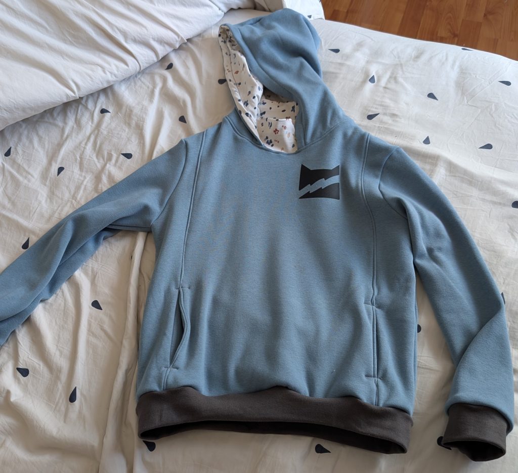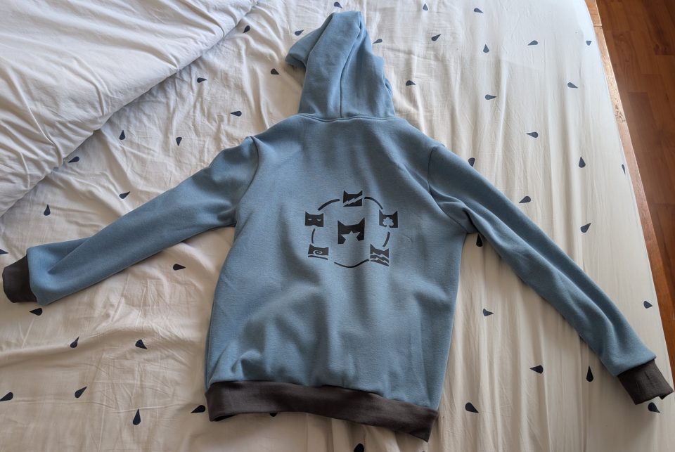 Pour l’anniversaire de Judith, un sweat Keefe de Wissew en 10 ans. Le tissu est une polaire alpine de chez Hemmers en 330g/m², et un jersey à pois pour la doublure de la capuche. Aucune surprise je commence à connaître ce patron par cœur, tout tombe comme il faut. Pour aller dans le thème du moment il est déclaré au couleur de son clan préféré, le clan du tonnerre. Dans le dos, le symbole de tous les clans. Le plus pénible a été le flocage qui doit se faire à sec, et non pas à la vapeur comme j’ai longtemps tenté de le faire.
